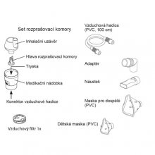 - Obsahuje: Set rozprašovací komory , 1x vzduchový filtr, pediatrickou masku, masku pro dospělé, náustek, adaptér na masku, vzduchovou hadici